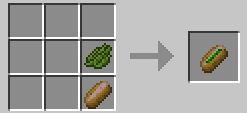 This mod provides a hot dog food item for Minecraft. The recipes are relatively simple, including uses for ROTTEN FLESH, BREAD, FLOWER RED, FLOWER YELLOW, and CACTUS GREEN.